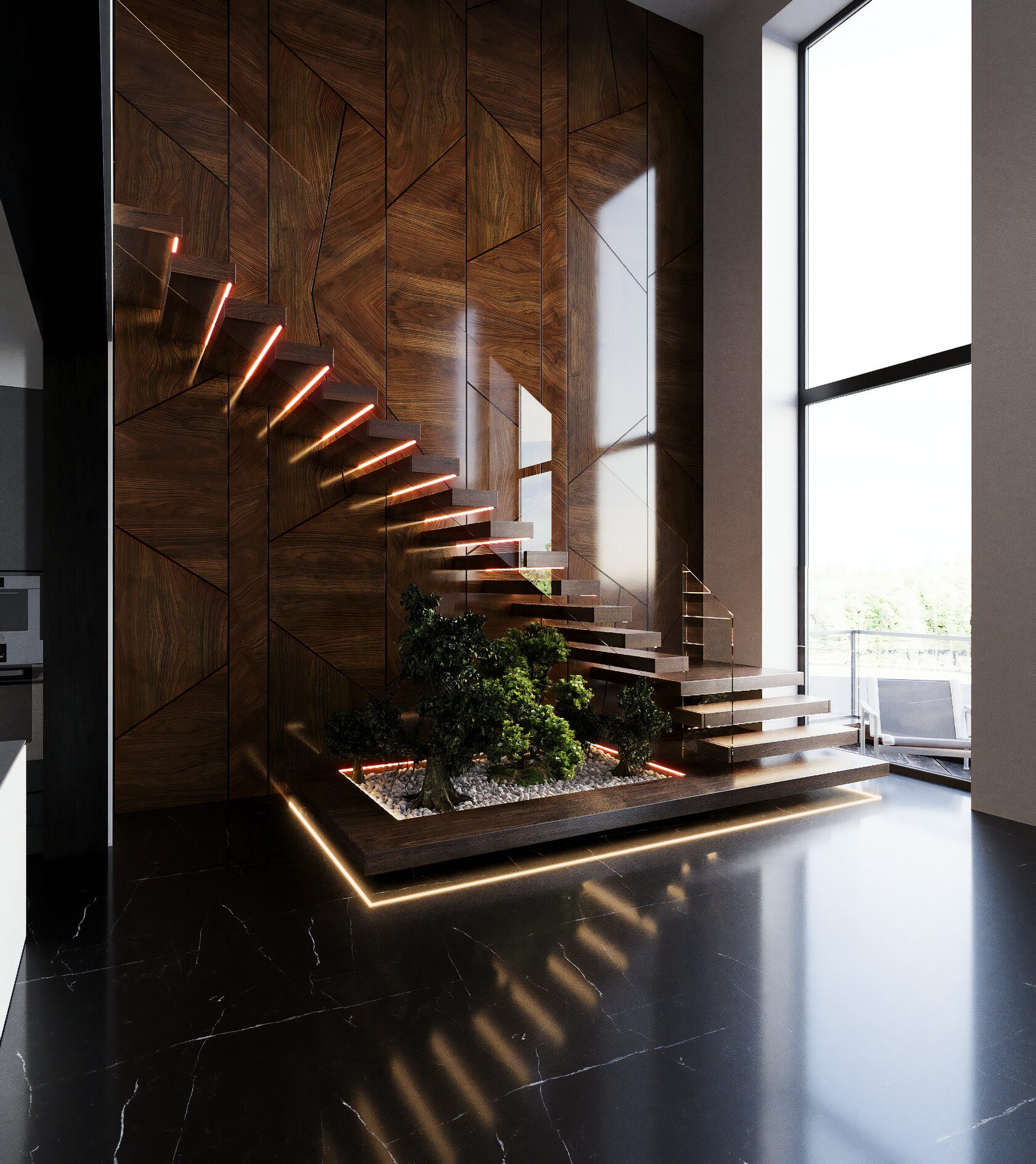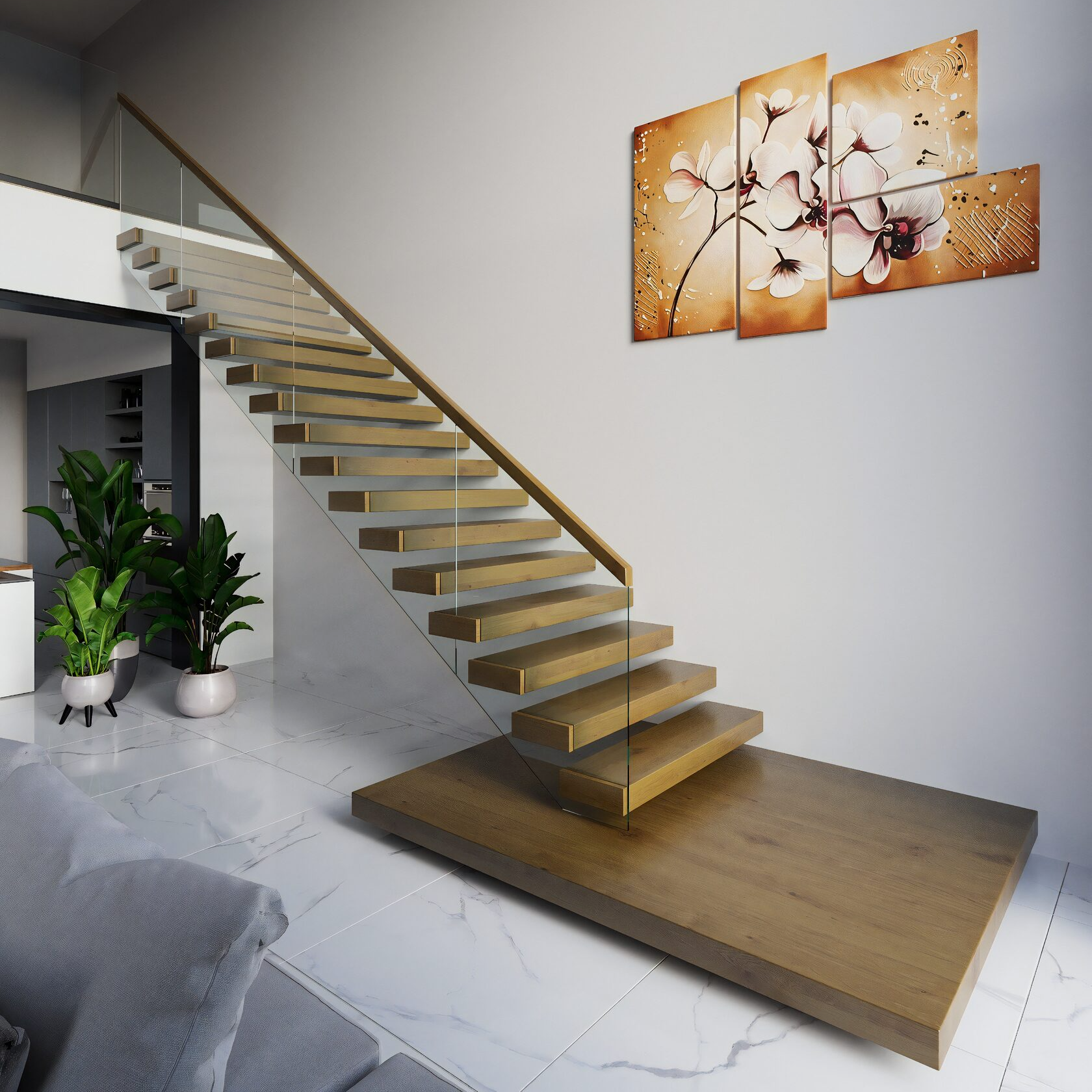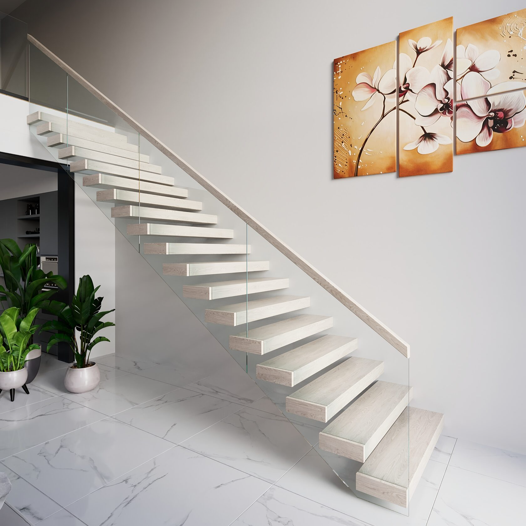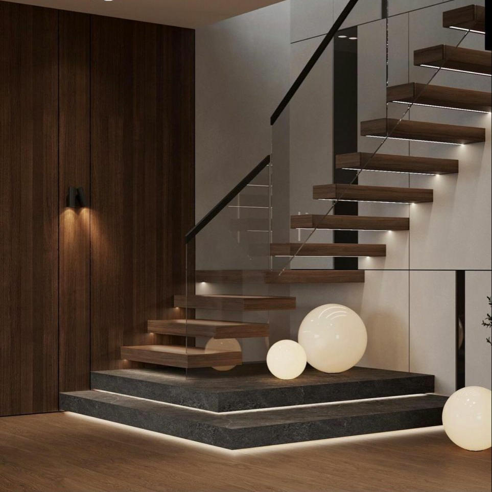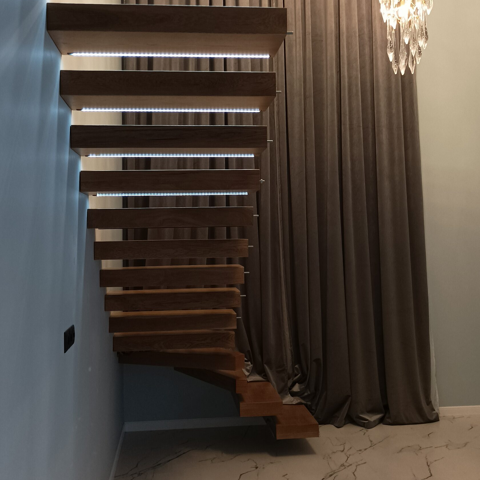 Парящая лестница в доме Консольная лестница представляет собой современное решение, которое позволяет визуально расширить пространство и добавить легкости интерьеру. Такие лестницы крепятся непосредственно к стене без использования дополнительных опор, создавая иллюзию парения ступеней в воздухе. Это идеальный вариант для стилей, где ценятся минимализм и открытость пространства. парящая лестница может быть укомплектована стеклянными или металлическими перилами для дополнительной безопасности и эстетики.